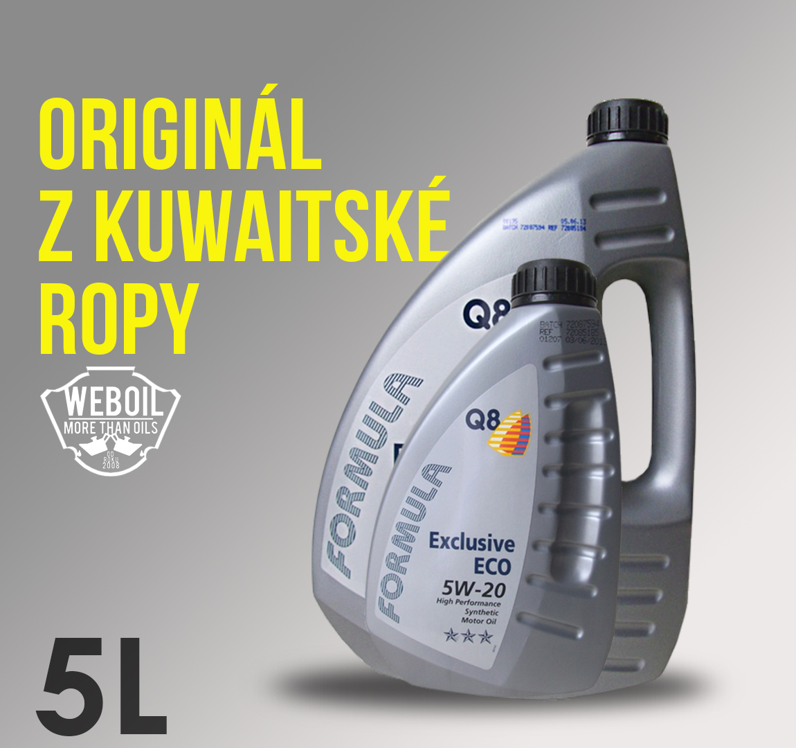 Motorový olje Q8 Formula Exclusive Eco 5w-20 je syntetický, nízko viskózní, vysoce výkonný motorový olej pro osobní automobily. Umožňuje snížení spotřeby paliva. Speciálně vhodný pro nejnovější generaci benzínových motorů Ford Ecoboost Euro 5 s přímým vstřikováním paliva. Hodí se i pro atmosférické a přeplňované benzínové, naftové a LPG motory vyžadující specifikaci Ford M2C 948-B.
